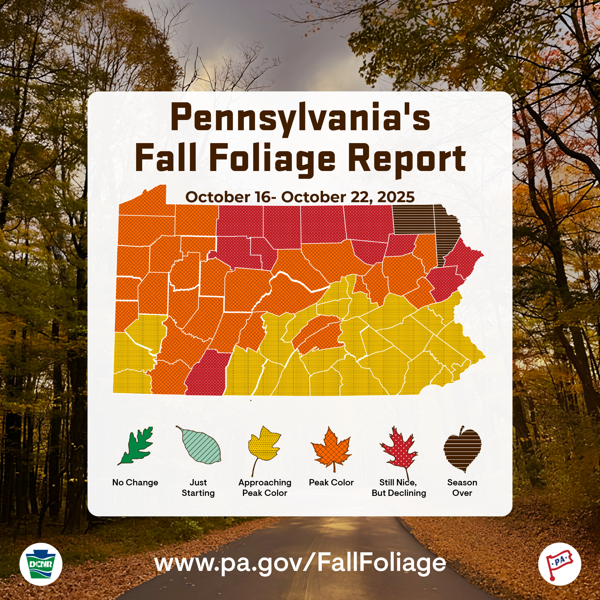 Forestry staff in Bald Eagle State Forest (serving Mifflin, Snyder, Union counties) said foliage is approaching best color in the region. You can currently see full color on species such as sweet birch, red maple, black gum, and sassafras. The oaks have started to show color across the district.