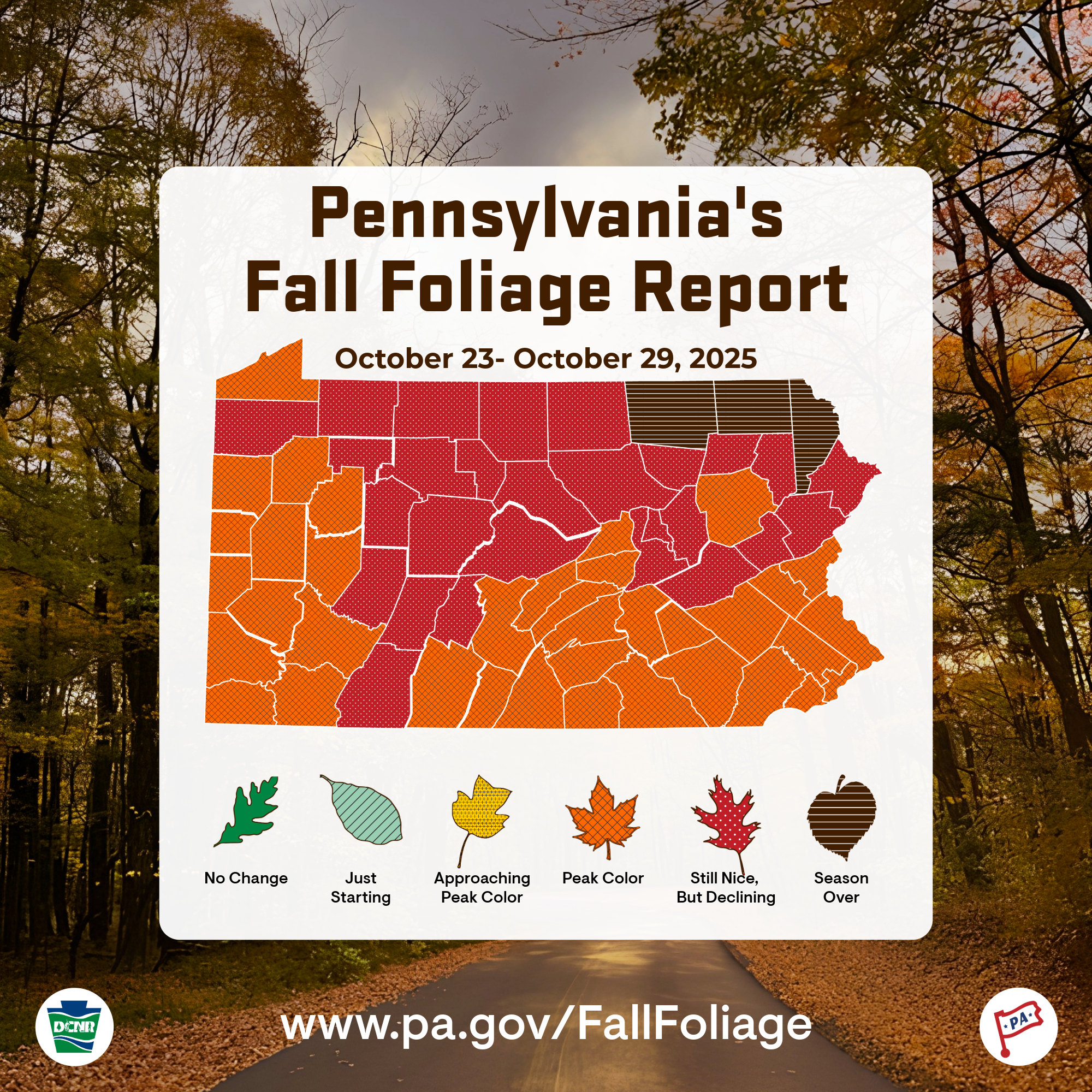 Foresters in William Penn State Forest said all counties in southeastern PA are full of beautiful fall color, with peak conditions prevailing. Red maple is in full red, with beautiful shades of yellow on hickories. Fall color can be observed everywhere in the district, but for a special viewing opportunity, the fall foliage tour in Boyertown on the Colebrookdale Railroad is recommended.