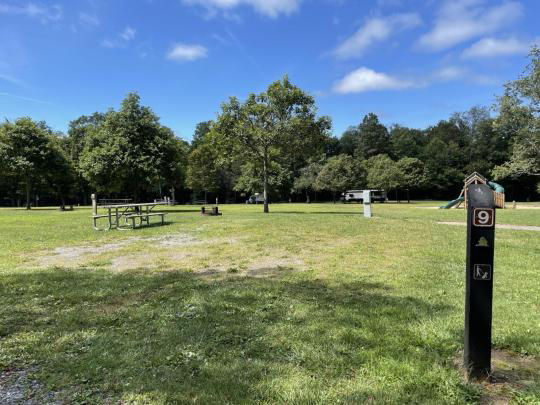 Site 9 on Sassafras Lane offers modern 30-amp electric service with a back-in driveway and a maximum vehicle length of 30 feet. Domestic pets are allowed.