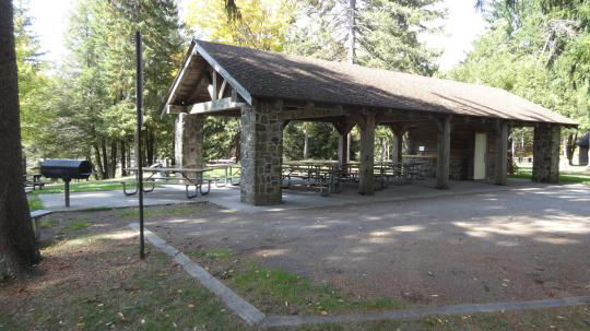 The Falls Pavilion can accommodate up to 64 people at 8 picnic tables. Domestic pets are allowed.