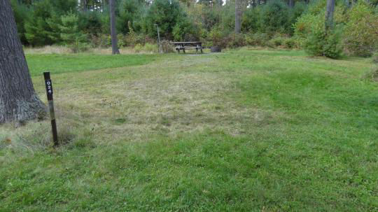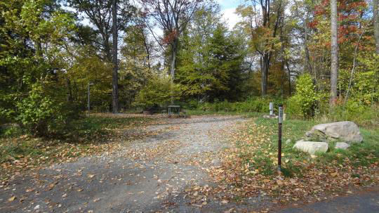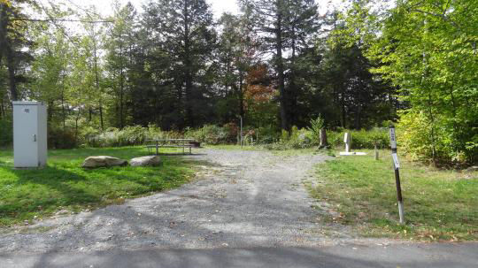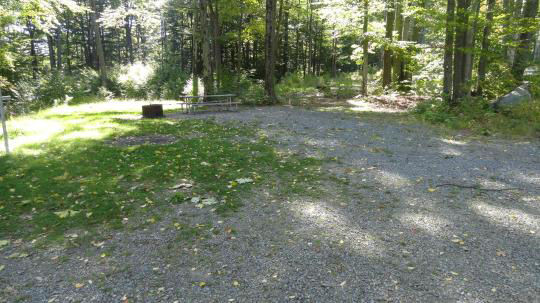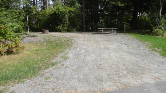 Site 201 in the Deerfield Campground offers a modern, non-electric setup with a gravel back-in driveway. The driveway is 60 feet long, accommodating vehicles up to 55 feet in length, and domestic pets are allowed.