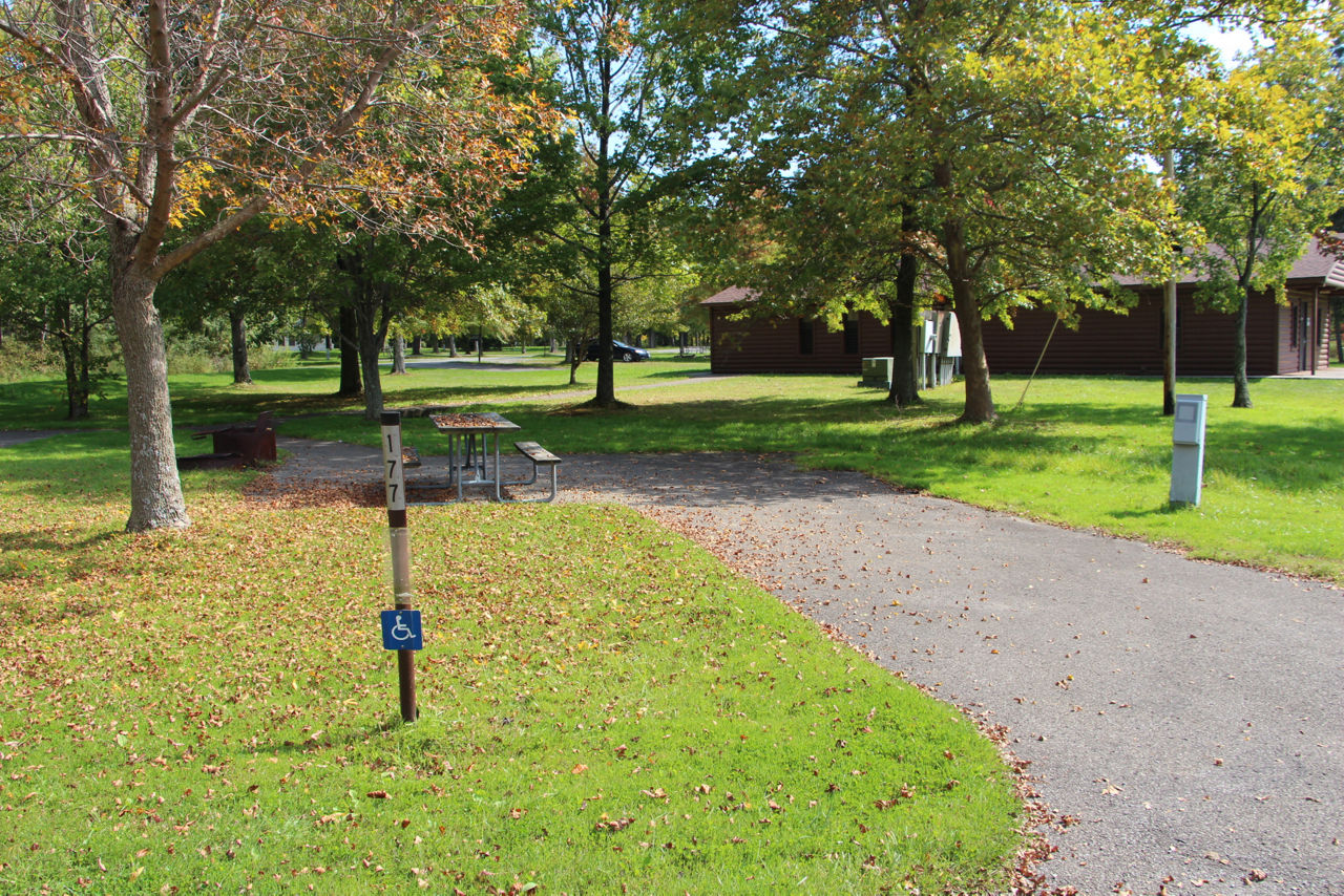 Site 177 in the Linesville Campground offers modern electric service with 50 amps and a paved back-in driveway. The driveway is 45 feet long, accommodating vehicles up to 30 feet in length, and domestic pets are allowed.