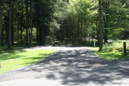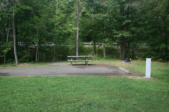 Site 18 in Loop A features modern electric service with 50 amps and a paved back-in driveway. The driveway is 50 feet long, accommodating vehicles up to 40 feet in length, and domestic pets are allowed.