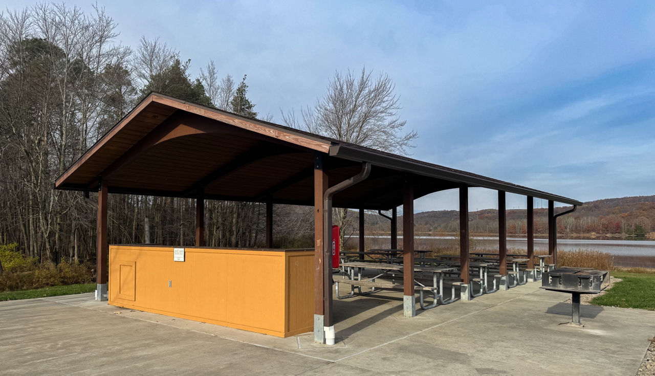 The North Shore pavilion can accommodate up to 75 people at 12 picnic tables. Domestic pets are allowed.
