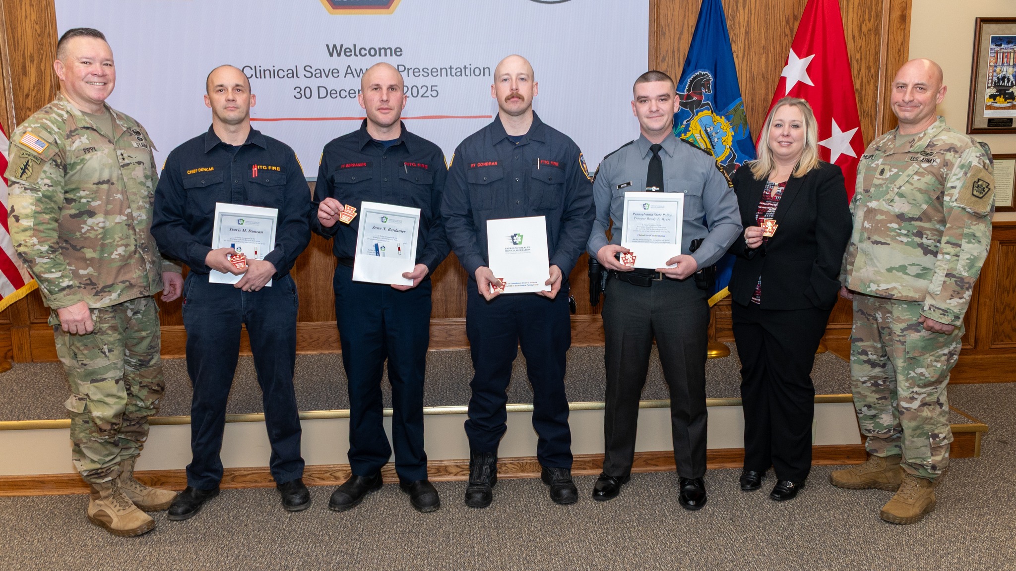Pennsylvania Department of Military and Veterans Affairs (DMVA) firefighters Benjamin Condran, Jesse Berdanier and Assistant Chief Travis Duncan were recently given the Emergency Health Services Federation Clinical Save Award during a ceremony at Fort Indiantown Gap (FTIG) Dec. 30, 2025. The Clinical Save Award is awarded to Pennsylvania first responders who display an exceptional service and dedication to their profession. Responding to a call for assistance along Interstate 81, they encountered a medical emergency that left a woman unresponsive with no breathing or pulse. The firefighters worked alongside responding Trooper Brody Myers, of Pennsylvania State Police, and together their quick action led to her resuscitation and, ultimately, full recovery. Their courageous actions and collaborative teamwork are yet another example of the commitment and dedication of our commonwealth employees. The great working relationships our employees have developed exemplifies DMVA’s core principle, “One Team, One Mission!”