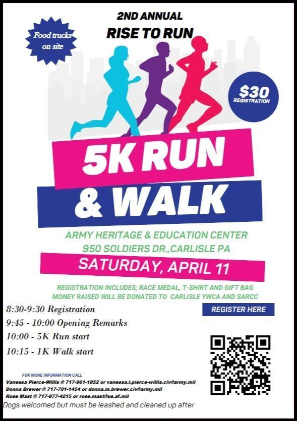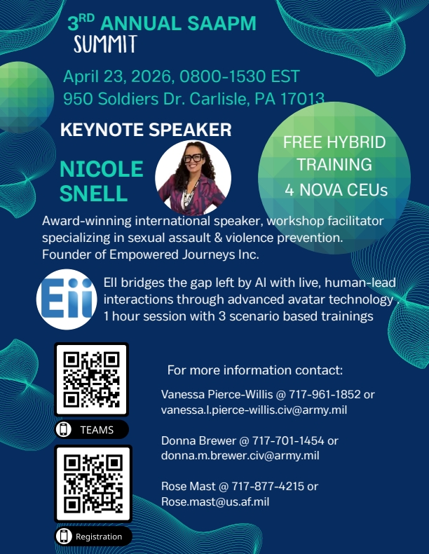 All are invited to participate in the Sexual Assault Awareness & Prevention Month (SAAPM) activities happening across the commonwealth on Pennsylvania National Guard (PANG) facilities. The annual Rise to Run five-kilometer race will be held April 11 at 9 a.m. at the Army Heritage and Education Center (AHEC). There will be vendors, a coffee truck and professional timing by Timberhill Timing. Dogs are welcome on a leash. Register for a race t-shirt today! Interested parties can spend the day learning and earning four continuing education units during the Annual Sexual Assault Prevention and Response (SAPR) Summit, also at the AHEC, April 23, at 8 a.m. Nicole Snell is keynote speaker, of Empowered Journeys Inc., along with emotional intelligence interactive scenarios with EII. Register today for a swag bag and a fun day of learning.