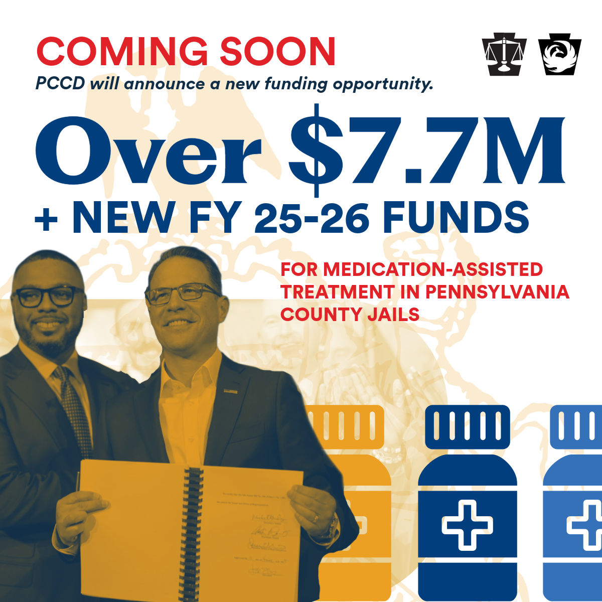 Act 45 of 2025, signed as part of the FY 2025-26 budget, temporarily expands access to additional types of FDA-approved Medication-Assisted Treatment (MAT) for substance use disorders that can be funded through PCCD’s MAT in County Jails Grant Program.