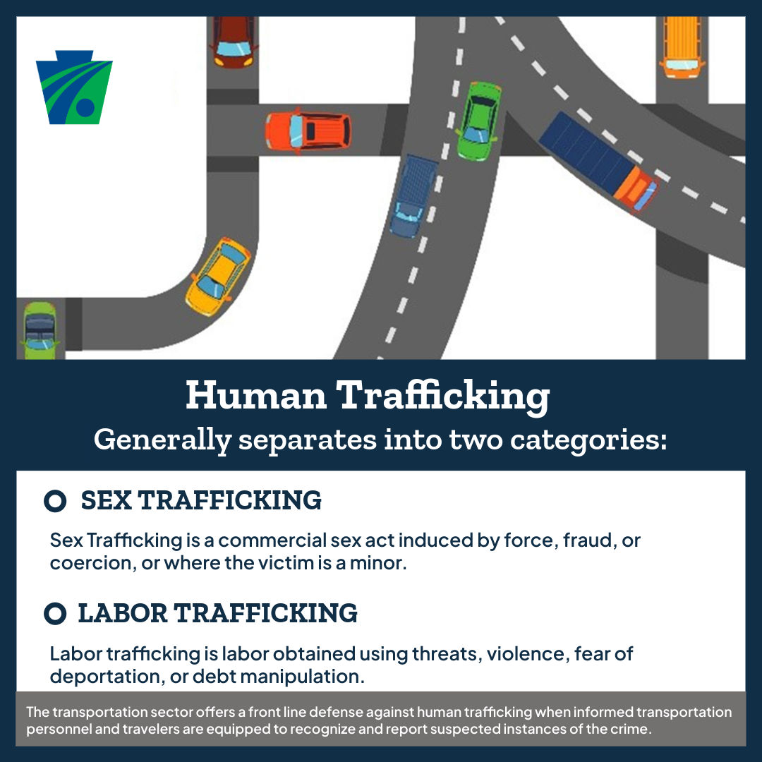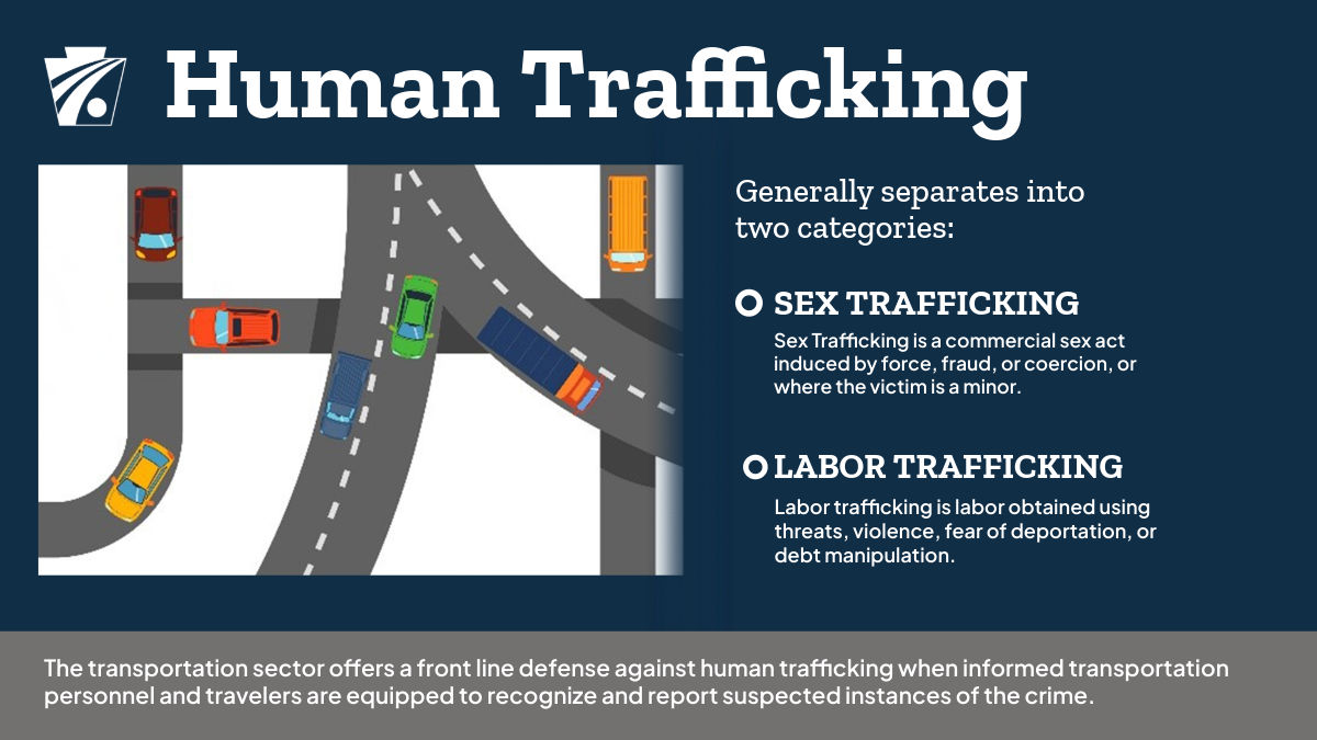 The PennDOT End Human Trafficking course for employees provides awareness on the subject of Human Trafficking and the various campaigns ran by organizations such as "Truckers Against Trafficking" and information on PA protection laws such as, Act 105, Act 130, Act 131 and Act 1. These efforts and many others show us how we can make a difference in the fight against Human Trafficking.