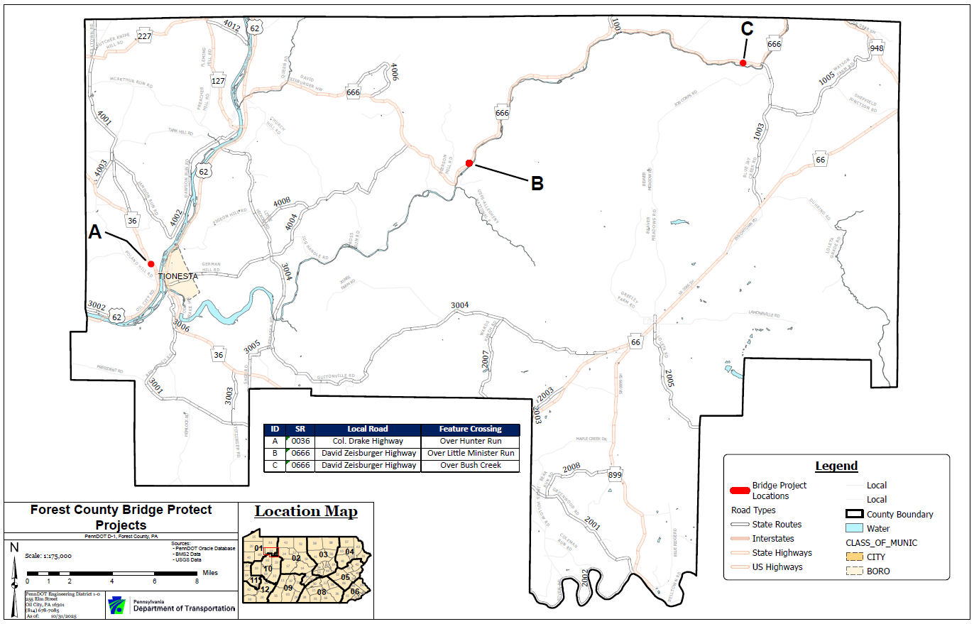 - Forest County – Route 666 over Little Minister Run. There will be minor, temporary impacts to the Army Corps of Engineers property. There will be no impacts to recreational areas.
