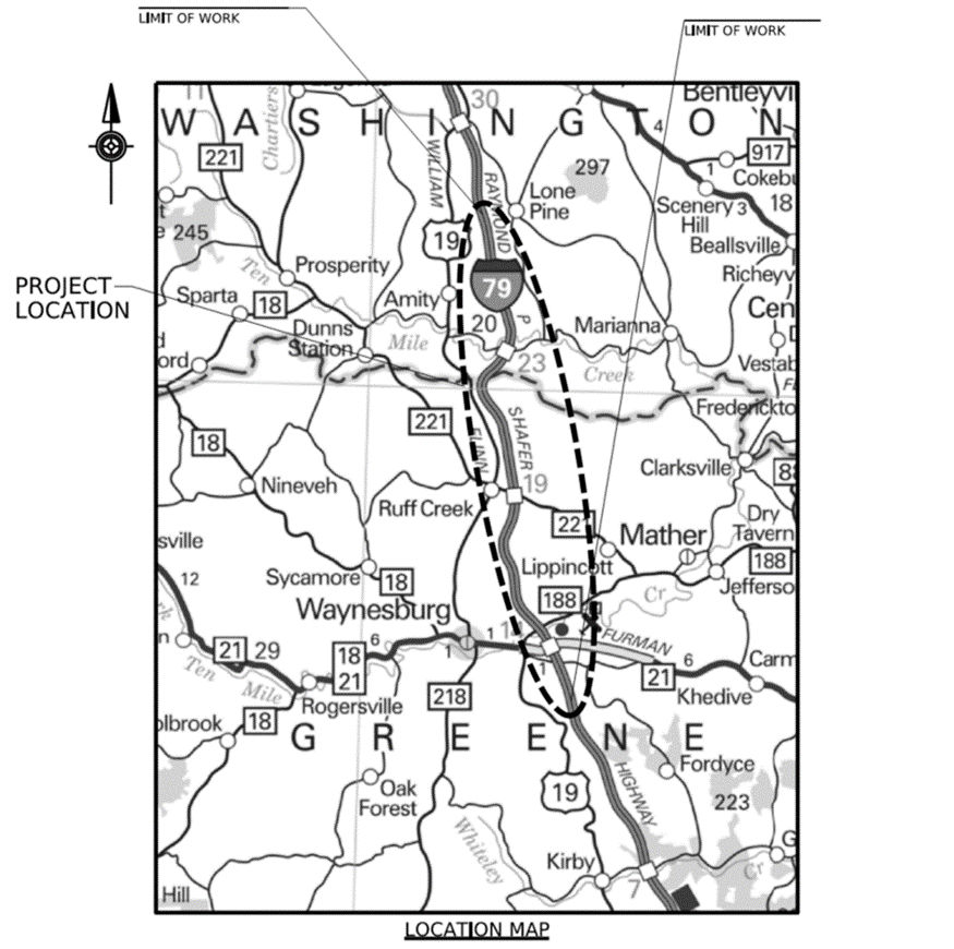 Located in Franklin and Washington Townships, Greene County and Amwell Township, Washington County this project begins one-half mile south of the Waynesburg Interchange (Exit 14), proceeds approximately 11.5 miles north through the Ruff Creek Interchange (Exit 19) and ends two miles north of the Marinna/Prosperity Interchange (Exit 23).