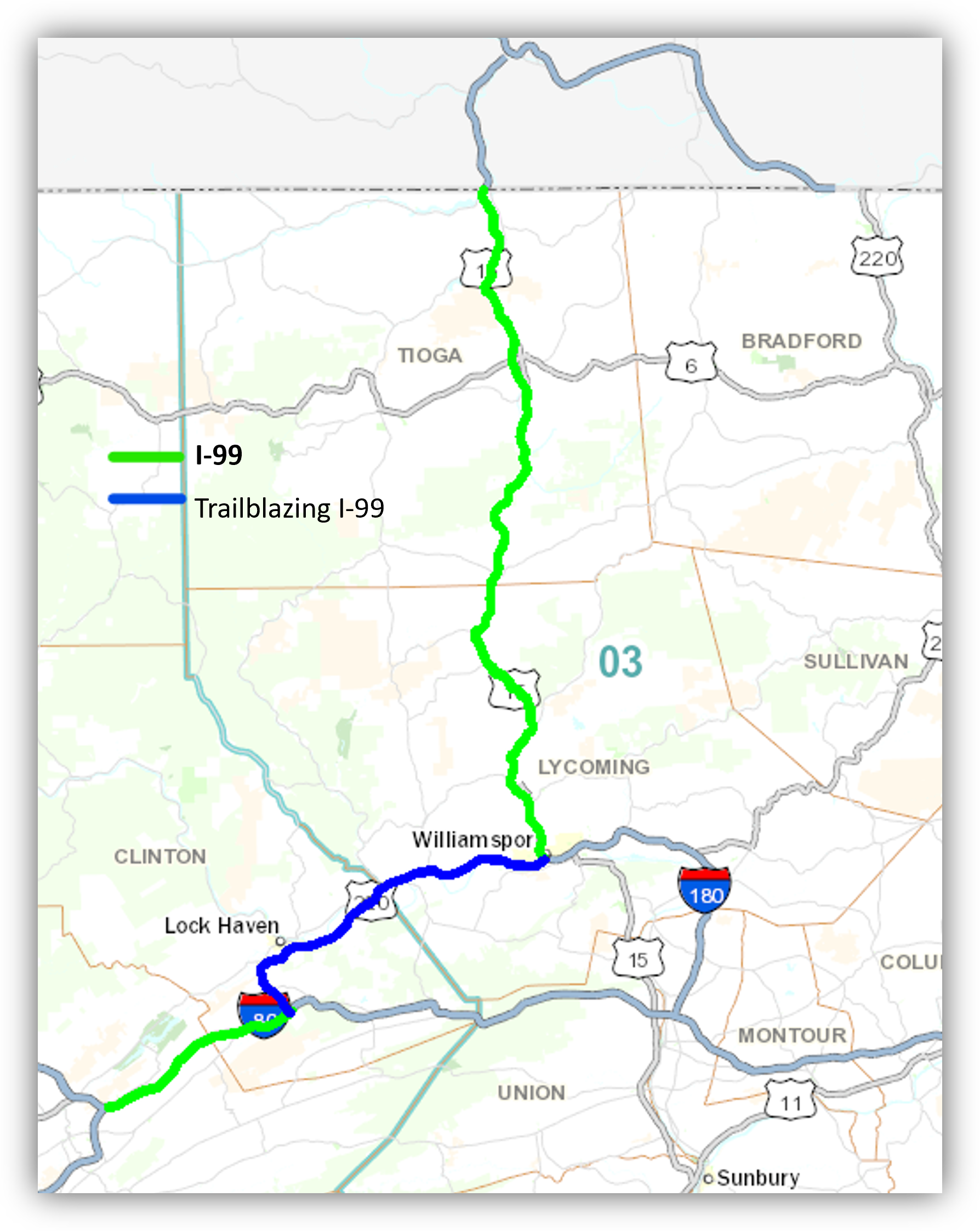 The department is in the final stage of seeking Federal Highway Administration (FHWA) approval to designate this roadway section as I-99. If approved, the current U.S. 15 between the City of Williamsport in Lycoming County, and the New York state border in Tioga County, will become I-99.