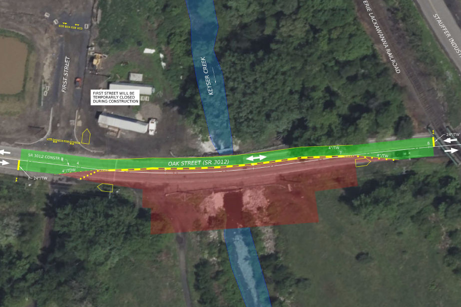 Route 3012 (Oak Street) proposed improvements will include the replacement of the existing two 5 foot diameter precast concrete pipes under fill that carry Oak Street over Keyser Creek with a new precast concrete box culvert. Approach roadway work will be minimal; approximately 130 feet on both approaches. Guide rail will be updated within the project limits and traffic will be maintained along with roadway via staged construction.