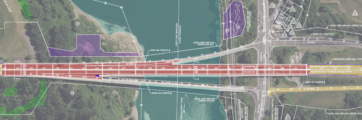The project is located in Plains Township, Kingston and Forty Fort boroughs in Luzerne County, and consists of the rehabilitation of the existing 17-span steel plate girder bridge that is approximately 2,278’ long. The partial superstructure replacement of the structure’s fracture critical spans and the rehabilitation of the remaining spans of the superstructure. The project will also include pavement overlays, lighting up grades and a few off-site improvements.