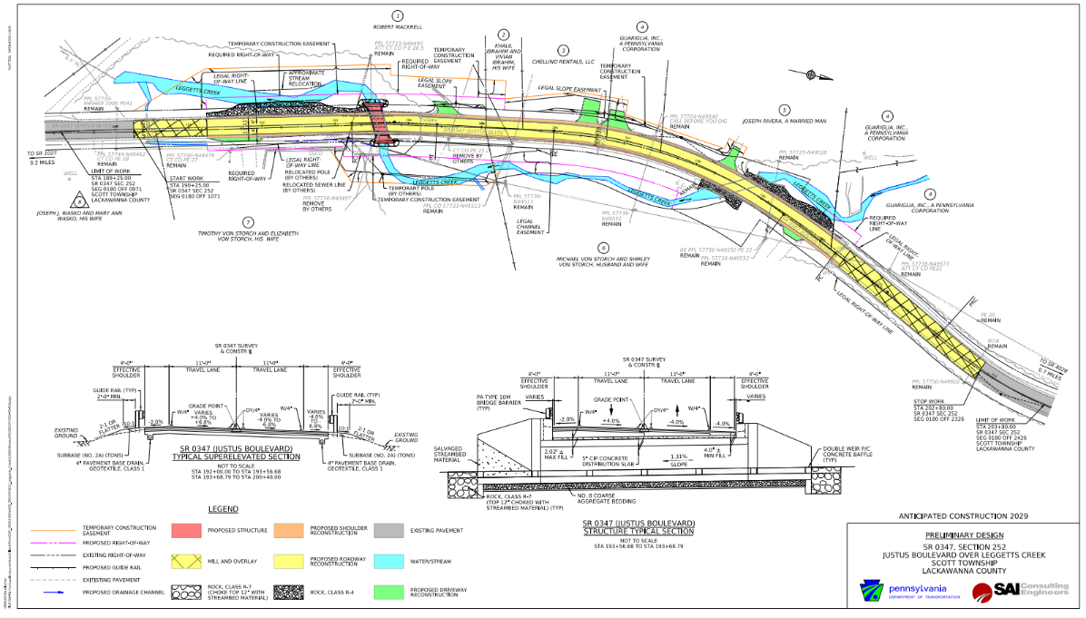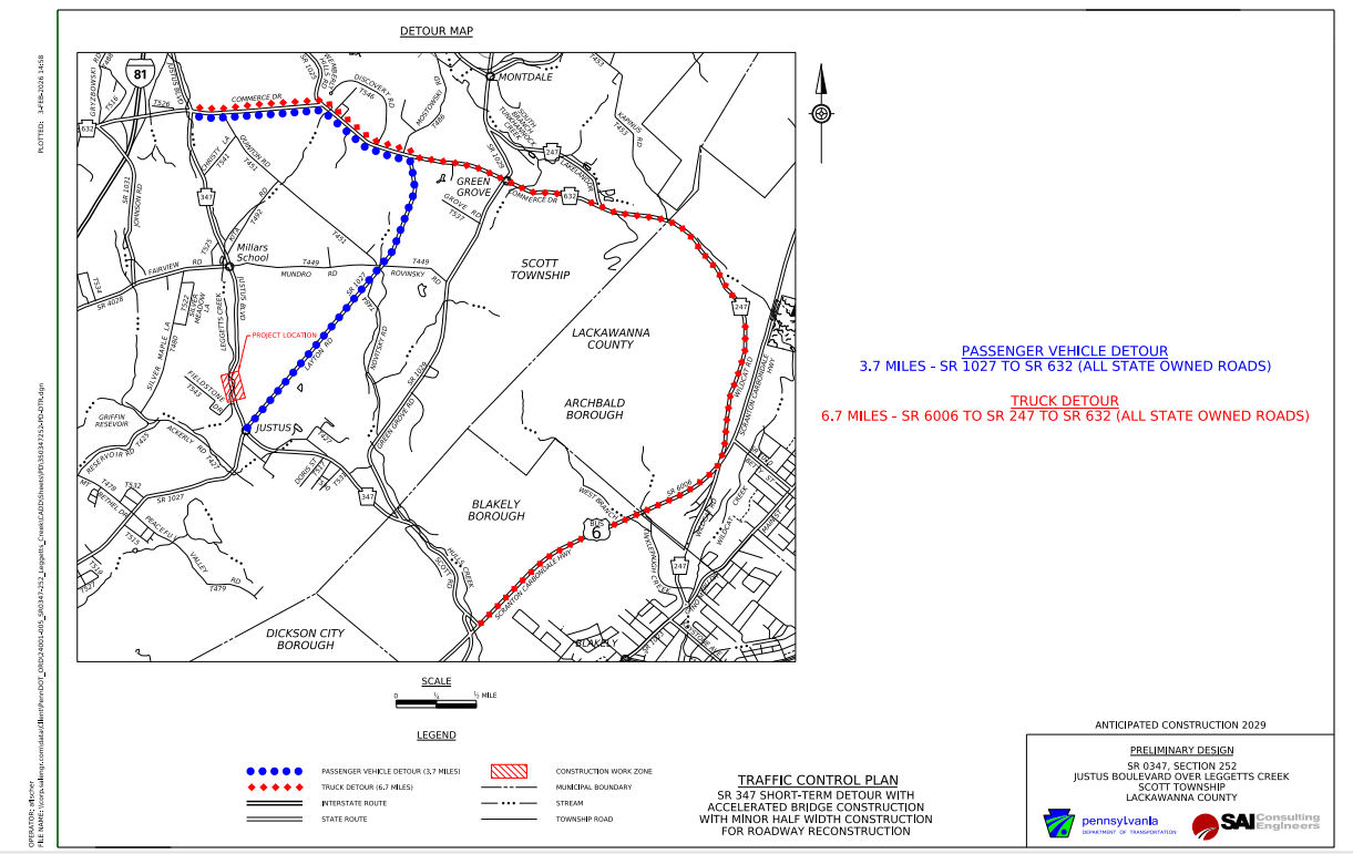 The Route 347 roadway will be closed to all traffic during the replacement of the existing structure over Leggetts Creek. A short-term detour (separate car and truck) will be put in place for approximately 10 days to complete the culvert construction. The remainder of the construction activities, including full-depth roadway reconstruction and guide rail improvements, will be completed during half-width construction controlled by temporary traffic signals. The truck detour route and car detour route will be posted as follows: