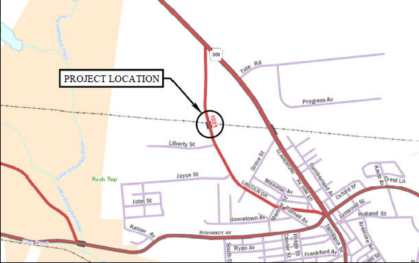 This project involves replacing the State Route 1021/Lincoln Drive Bridge over the Reading Blue Mountain and Northern Railroad. Located in Rush Township, Schuylkill County