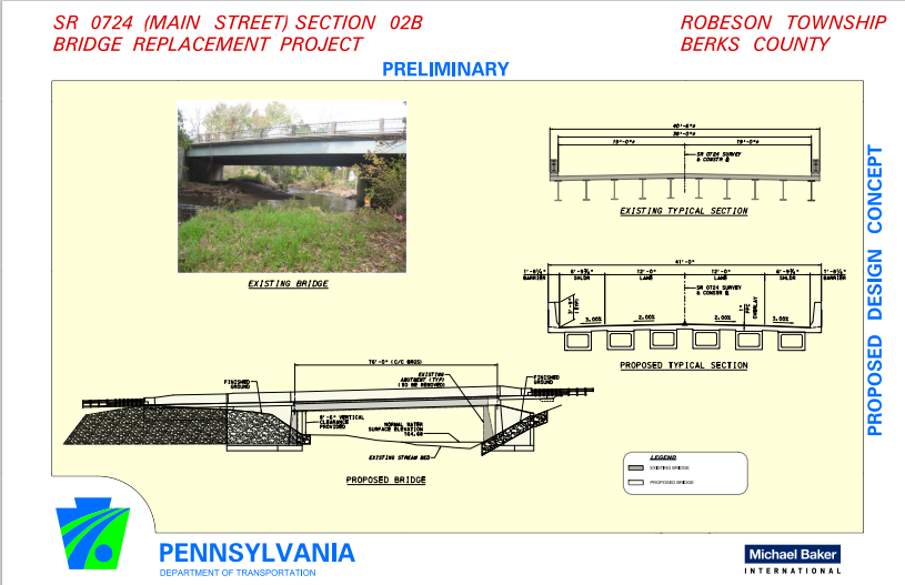 The existing bridge is 73 feet long and 41 feet wide and was constructed in 1956. The new structure will be 76 feet long and 41 feet wide. This section of Route 724/Main Street has an average daily traffic of 12,618 vehicles.