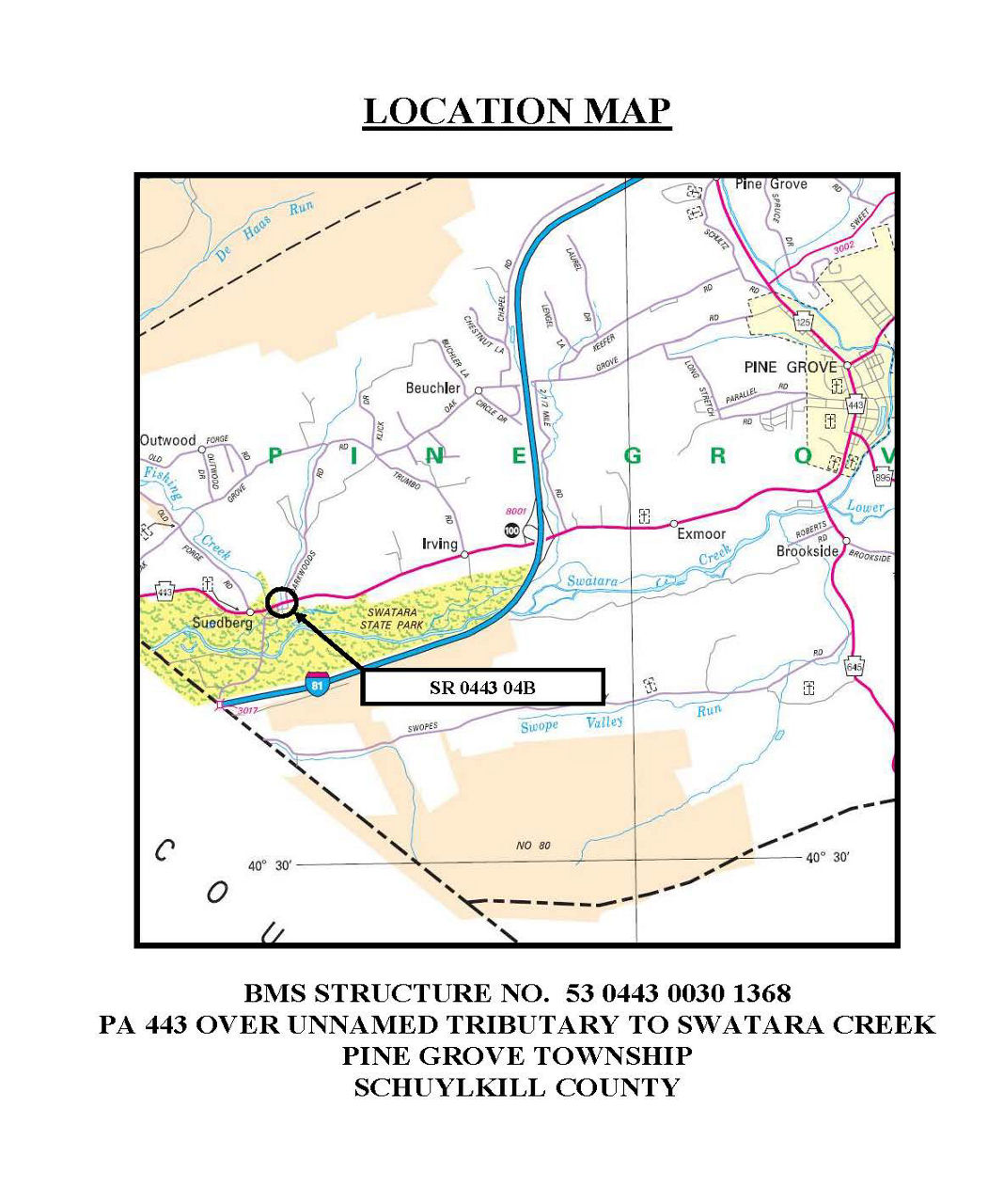 The existing bridge is a two-lane structure which carries Route 443 (Suedberg Road) over an unnamed tributary to Swatara Creek.