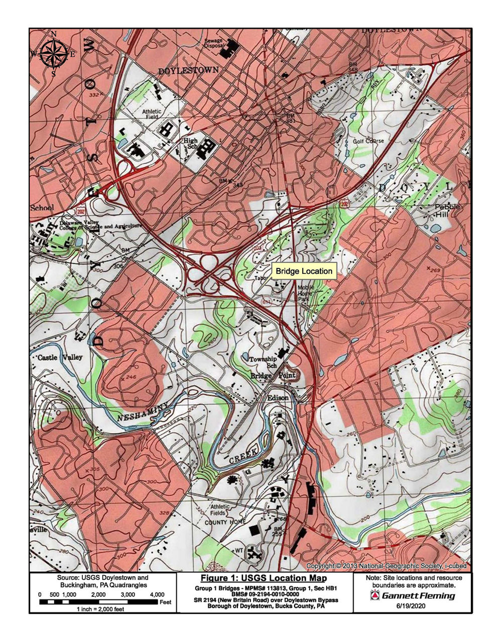 The proposed scope of work for the New Britain Road bridge over Doylestown Bypass includes steel beam end repairs. The bridge will be jacked for bearing replacements at the abutments and pedestal repairs at Pier 3, and all joints will be replaced. Concrete repairs will be performed on the substructure units, and the piers will receive a protective coating. Spall repairs will be made to the barrier, and there will be improvements made to the drainage. A concrete curb will be installed at the southwest approach. There will not be any modifications to the existing guiderail or the guiderail connections to the bridge barrier.