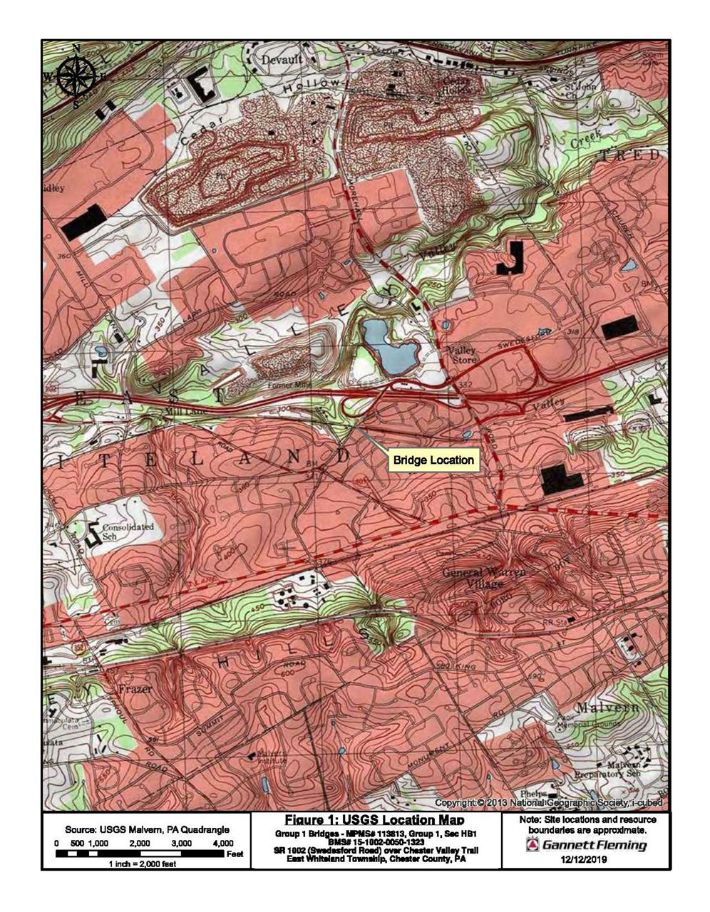 Construction will require a traffic detour or will be staged with one open lane. The anticipated detour is 1.5 miles, and the route utilizes Routes 401, 30, and 29. It is not anticipated that the Chester Valley Trail will need to be closed. No temporary construction easements will be required.