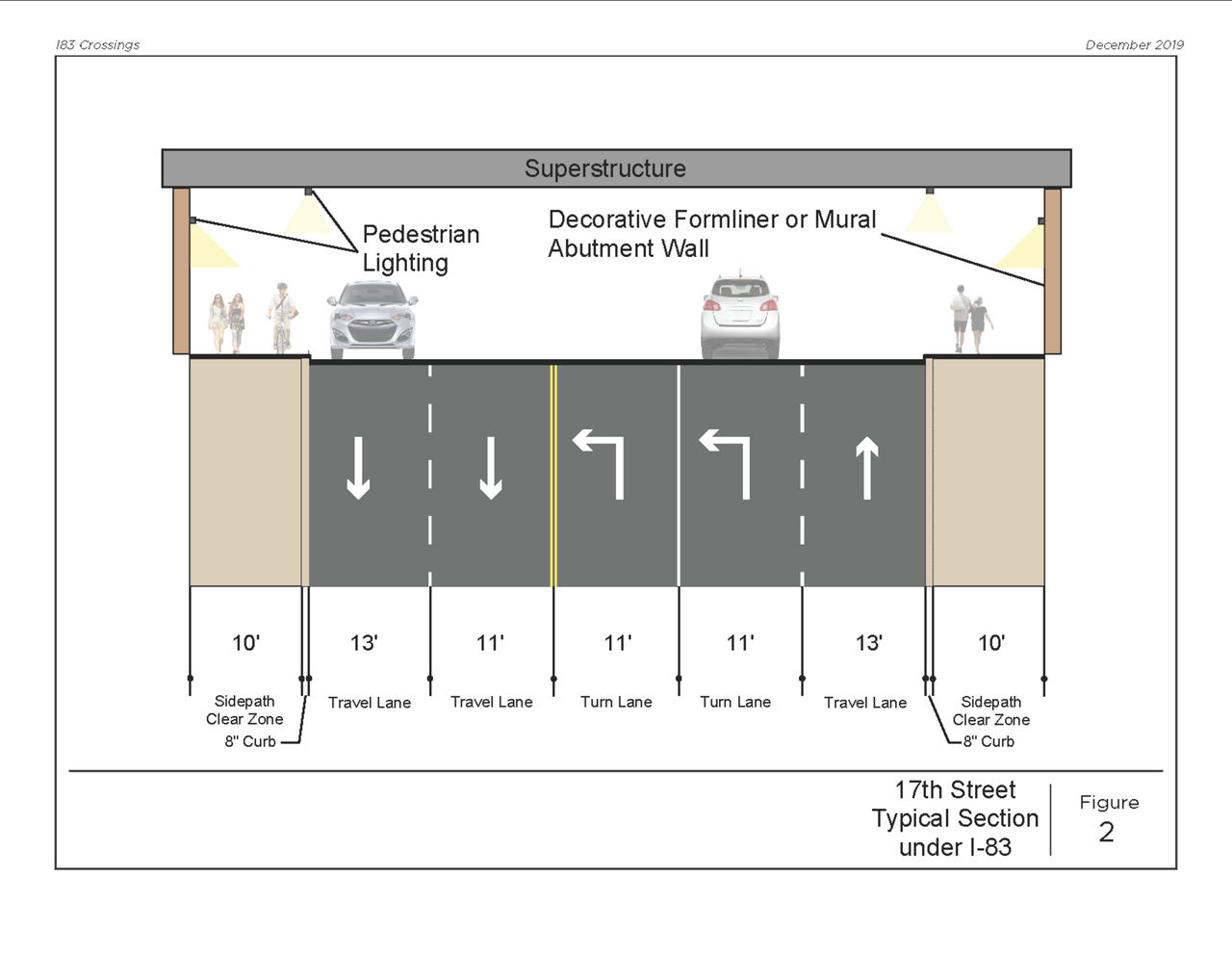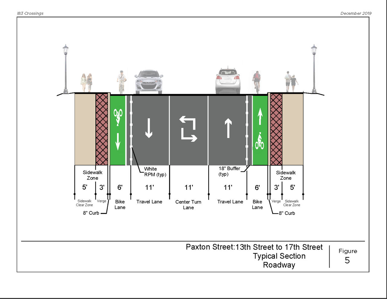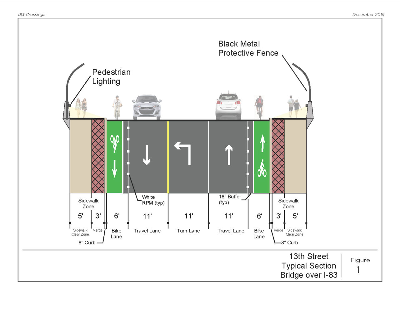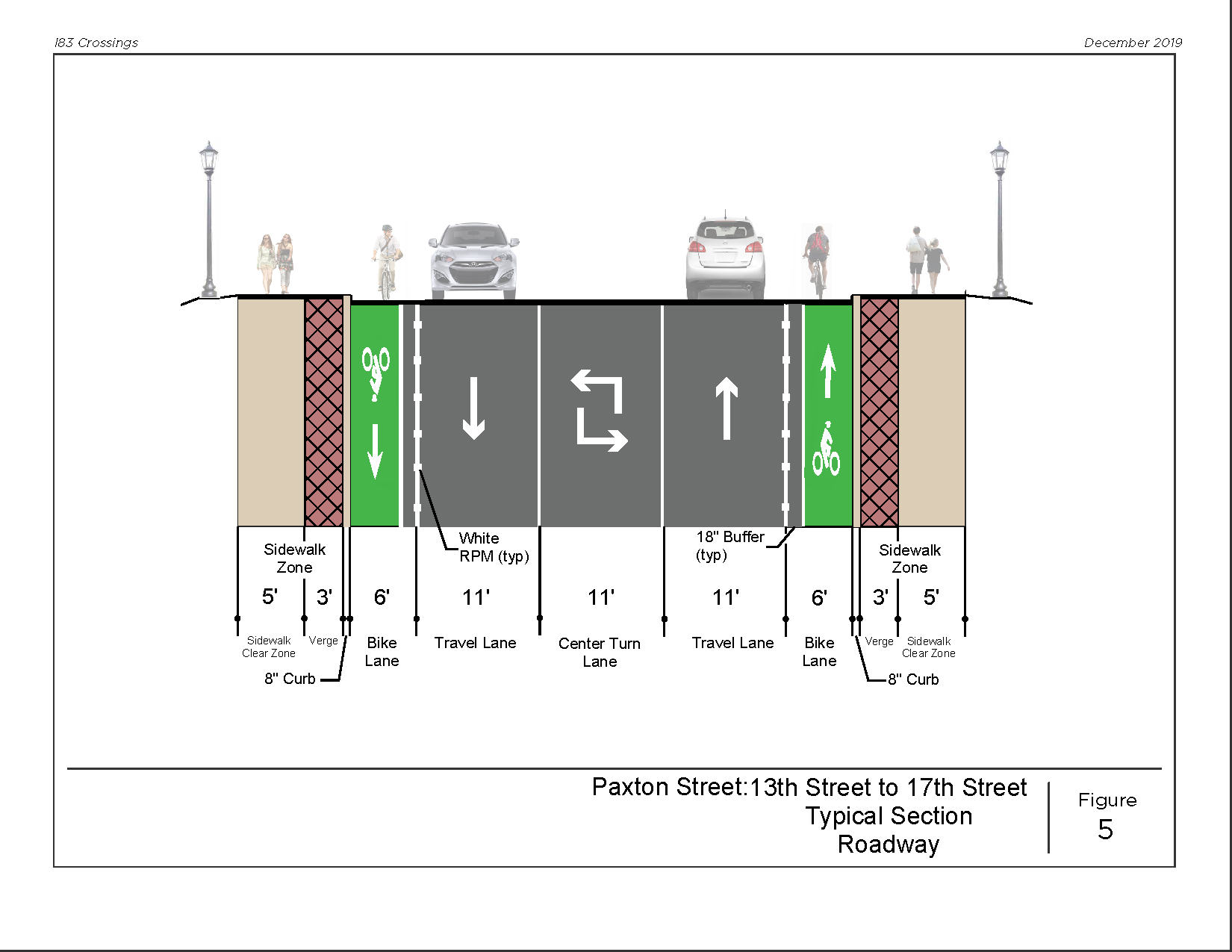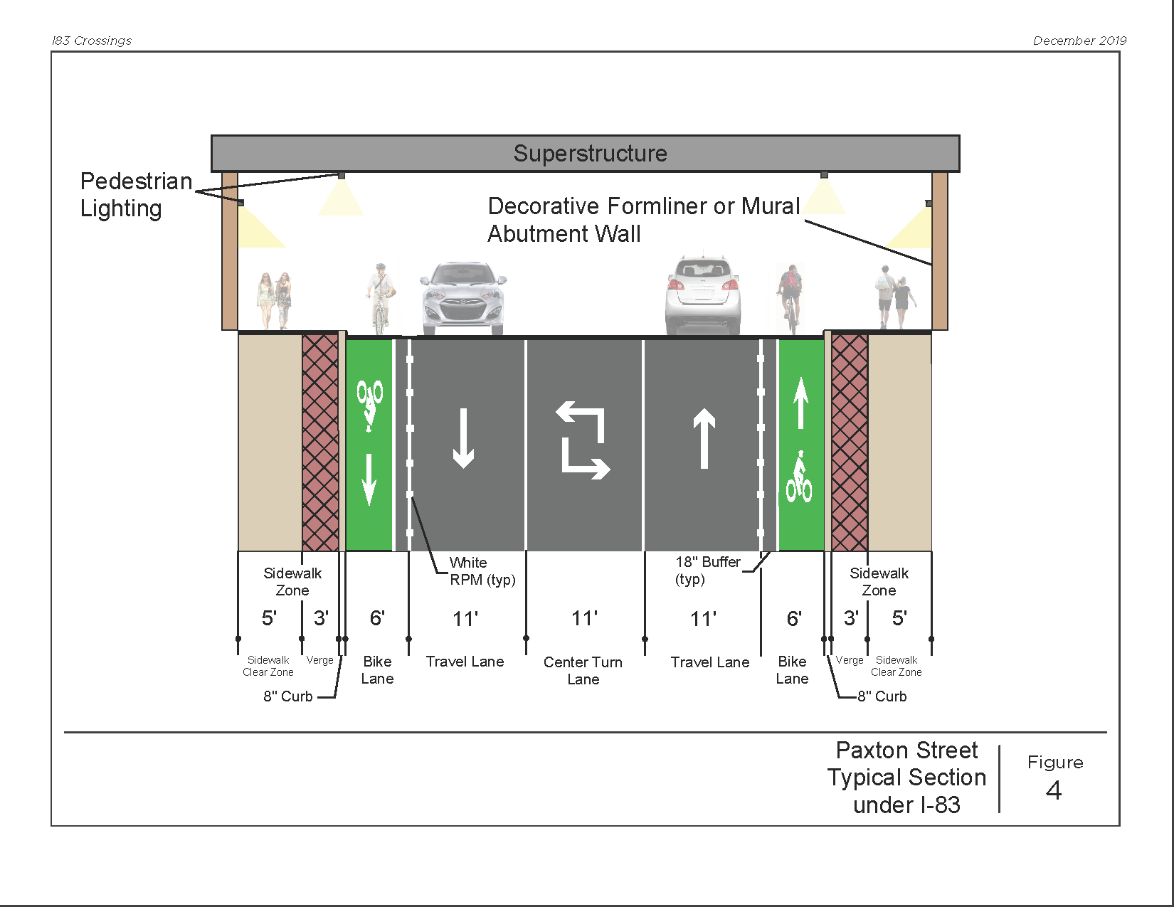 Over the past few weeks, the City of Harrisburg and PennDOT District 8 have met several times to discuss and further develop enhancements and refinements to the pedestrian and bicycle accommodations for the I-83 cross streets along 13th Street, 17th Street, 19th Street and Paxton Street from 13th to 17th Streets as shown on the typical sections below. These typical sections replace those from October 2019 update.