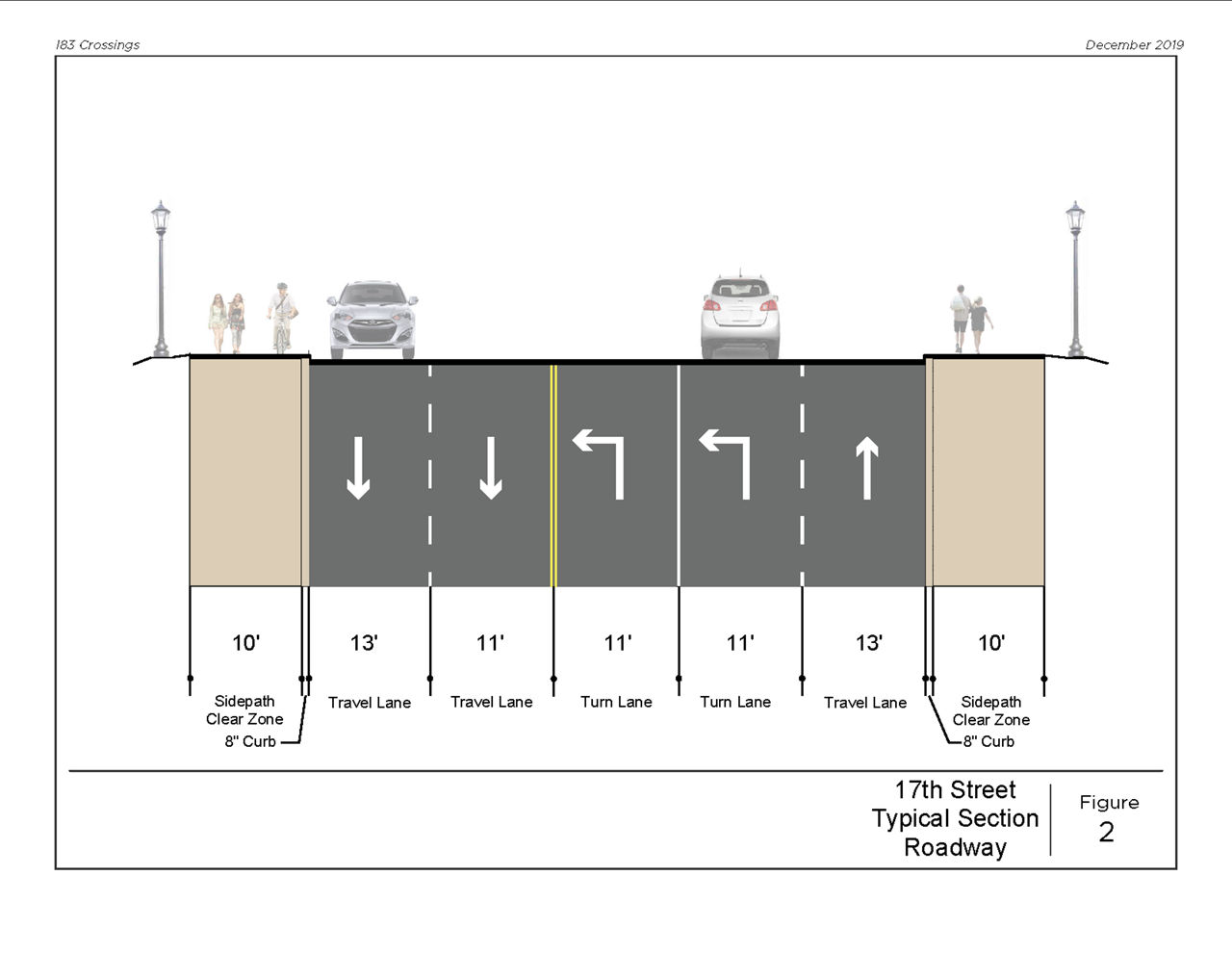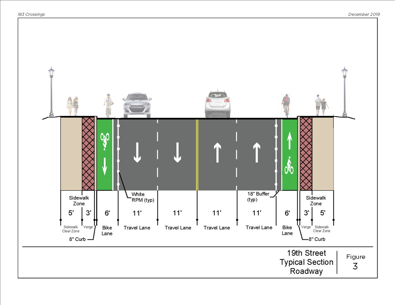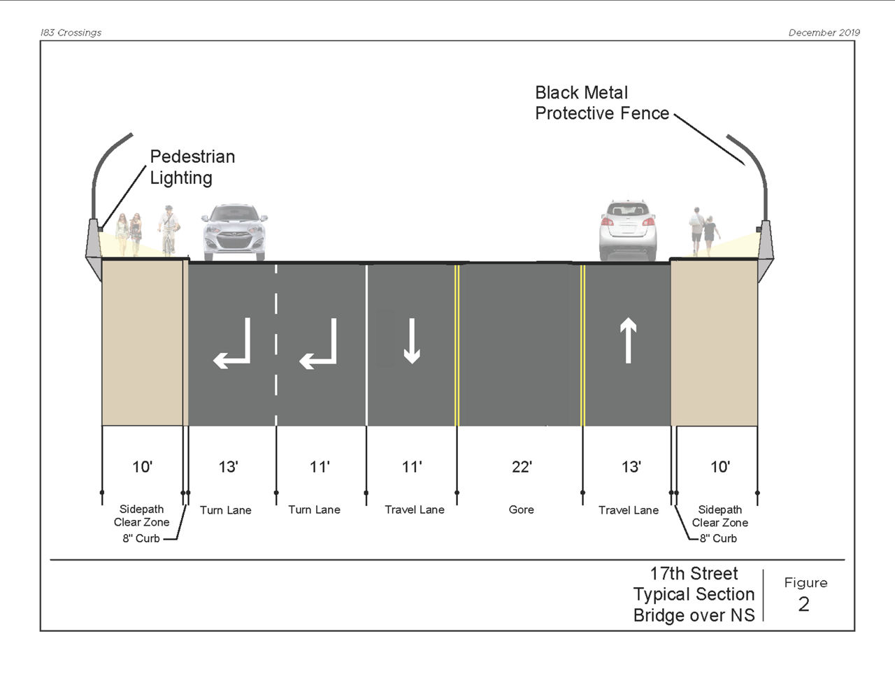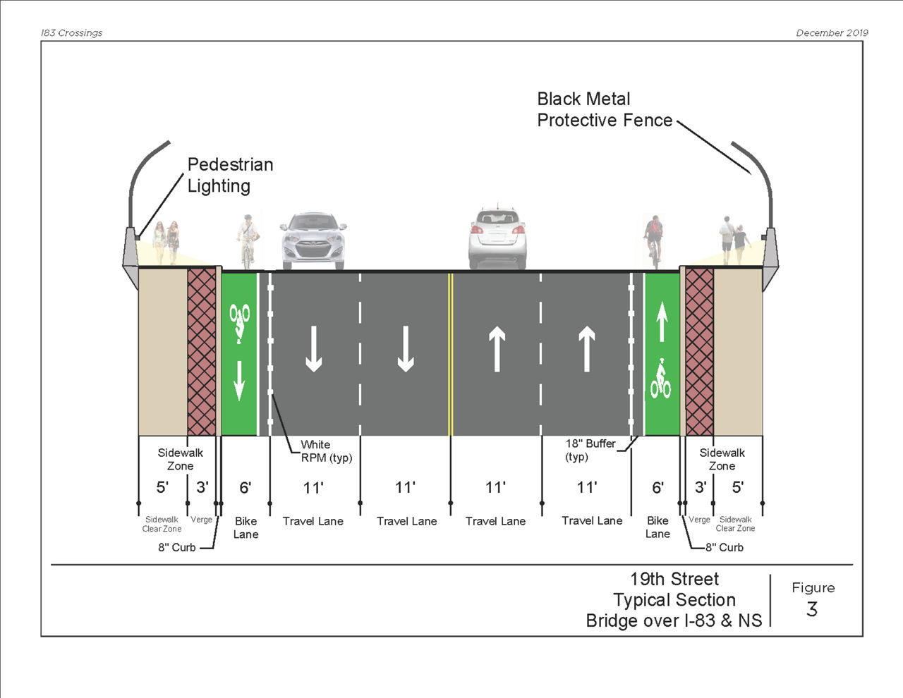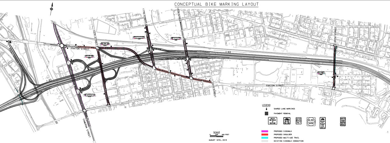 Over the past few weeks, the City of Harrisburg and PennDOT District 8 have met several times to discuss and further develop enhancements and refinements to the pedestrian and bicycle accommodations for the I-83 cross streets along 13th Street, 17th Street, 19th Street and Paxton Street from 13th to 17th Streets as shown on the typical sections below. These typical sections replace those from October 2019 update.