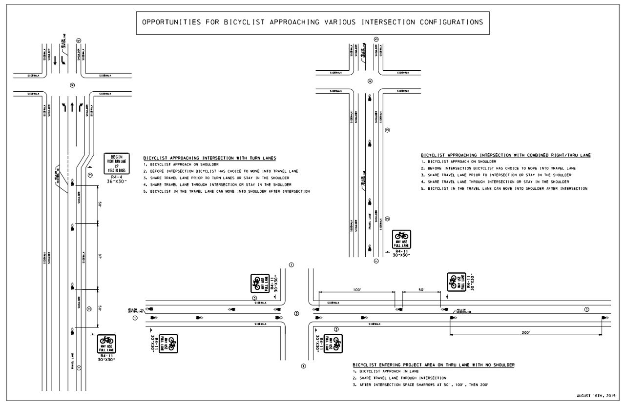As part of this coordination, standard signing and pavement markings were developed to assist bicyclists and motorists as they approach various intersections. Bicyclists have the choice to share the lane with motorist or remain on the shoulder. The figure below illustrates the standard situations.