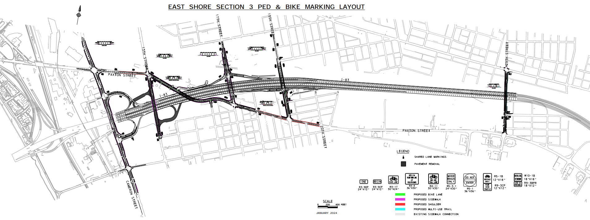 Bicycle and pedestrian accommodations are continuing to be refined as the project progresses through preliminary engineering. PennDOT’s Statewide Bicycle and Pedestrian Coordinator, Tri-County Regional Planning Commission’s Regional Planner dealing with bicycles and pedestrians, the City of Harrisburg, and Swatara and Lower Paxton Townships all participated in coordination efforts.