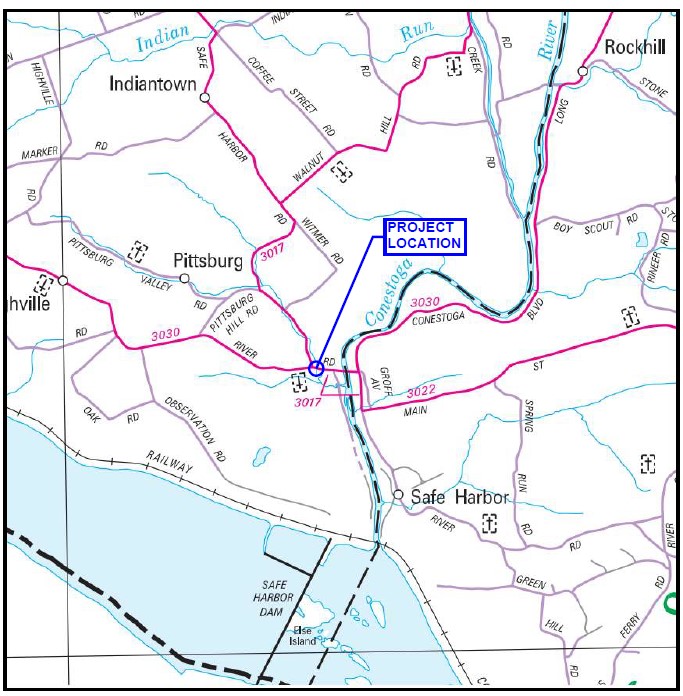 The project is located in rural, rolling terrain about one mile from Safe Harbor in Lancaster County near the Susquehanna River. Residential properties are located to the west of the bridge. Forested areas are located to the east of the bridge. Conestoga River Park, Safe Harbor Park, and a church are nearby but outside the project limits. Environmental review includes historical, archaeological, aquatic, and protected species investigations.