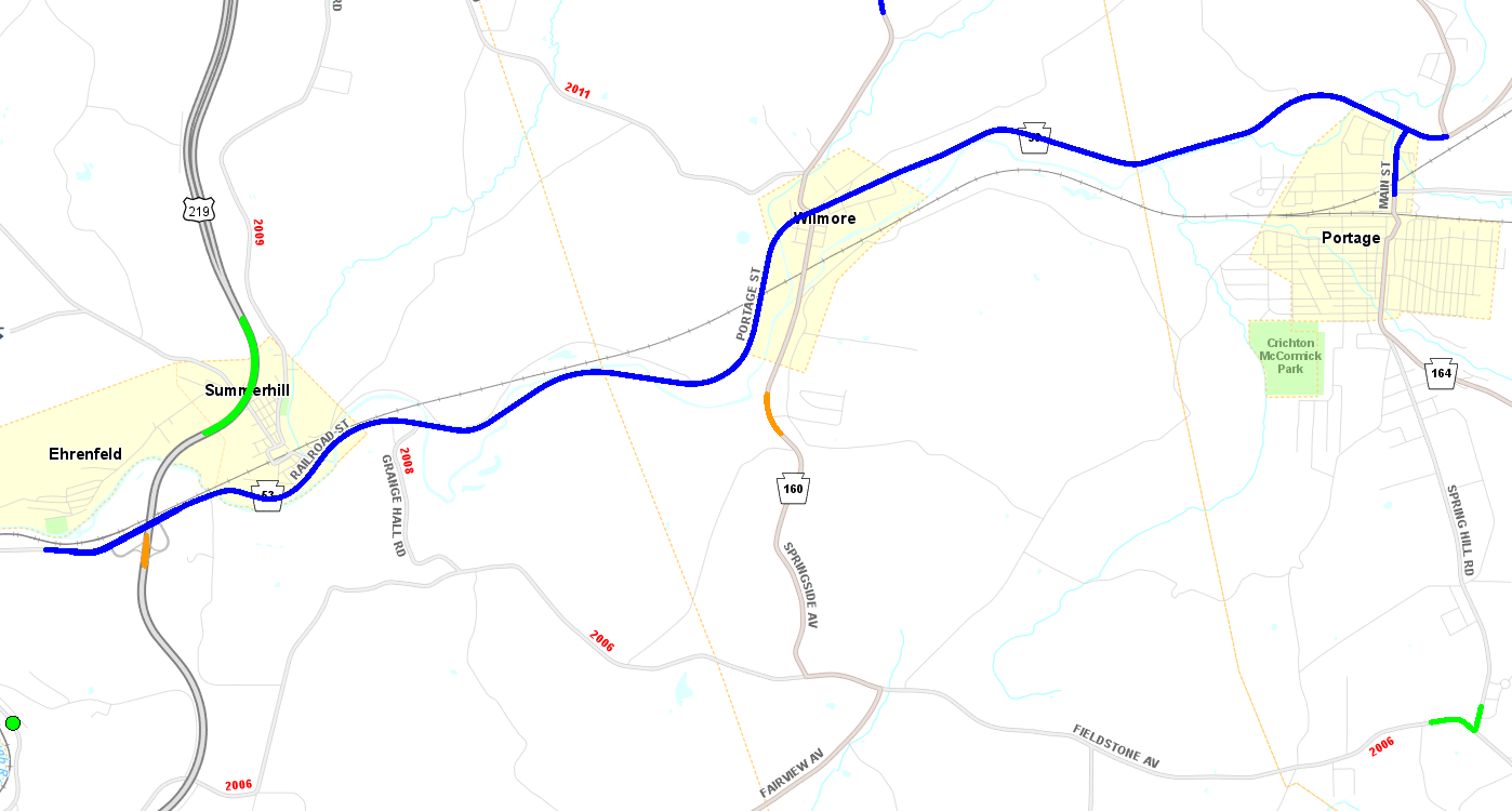 The Pennsylvania Department of Transportation (PennDOT) is developing plans for the Route 53 Pavement Preservation Project in Croyle Township, Ehrenfeld Borough, Summerhill Borough, Summerhill Township, Wilmore Borough, Portage Township, and Portage Borough, Cambria County. The project includes resurfacing of Route 53 in Cambria County from Route 3024 (Railroad Street) to Route 164 and on Route 164 from Route 53 to Route 2012 (Dulancey Avenue) in Croyle, Portage, and Summerhill townships and Portage, Summerhill, and Wilmore boroughs in Cambria County.