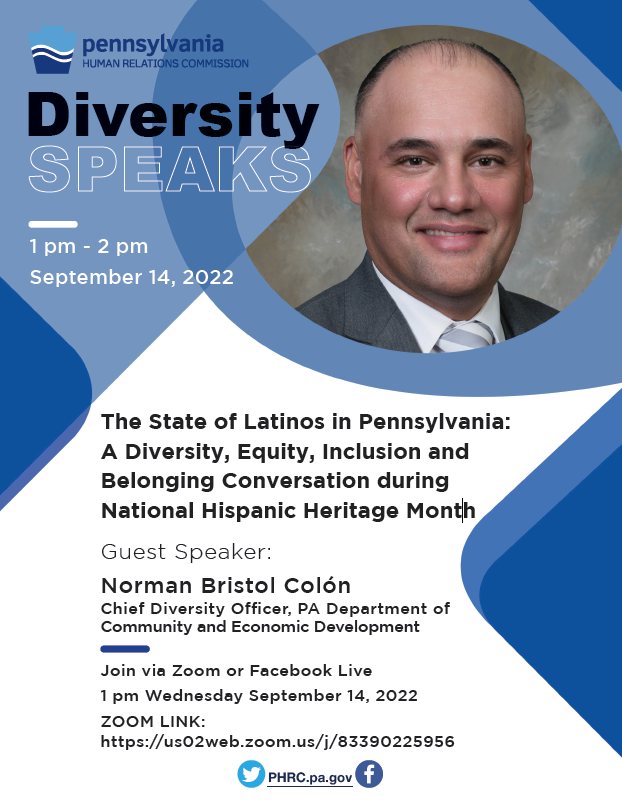 - "The State of Latinos in Pennsylvania, A Diversity, Equity, Inclusion, and Belonging Conversation during National Hispanic Heritage Month,[Image]" featuring Norman Bristol Colon. (September 14, 2022)