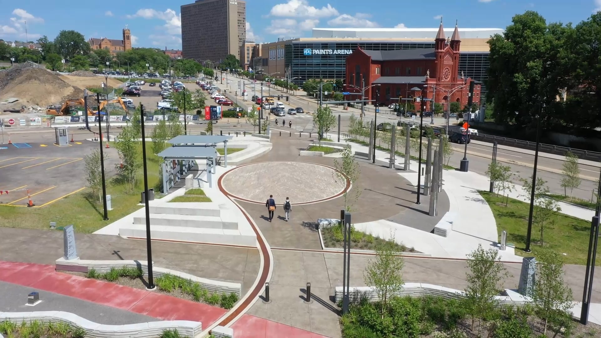 as well as provide new and improved links to public transportation at the nearby Steel Plaza subway station. The surface of the cap provides a new 3-acre public open space