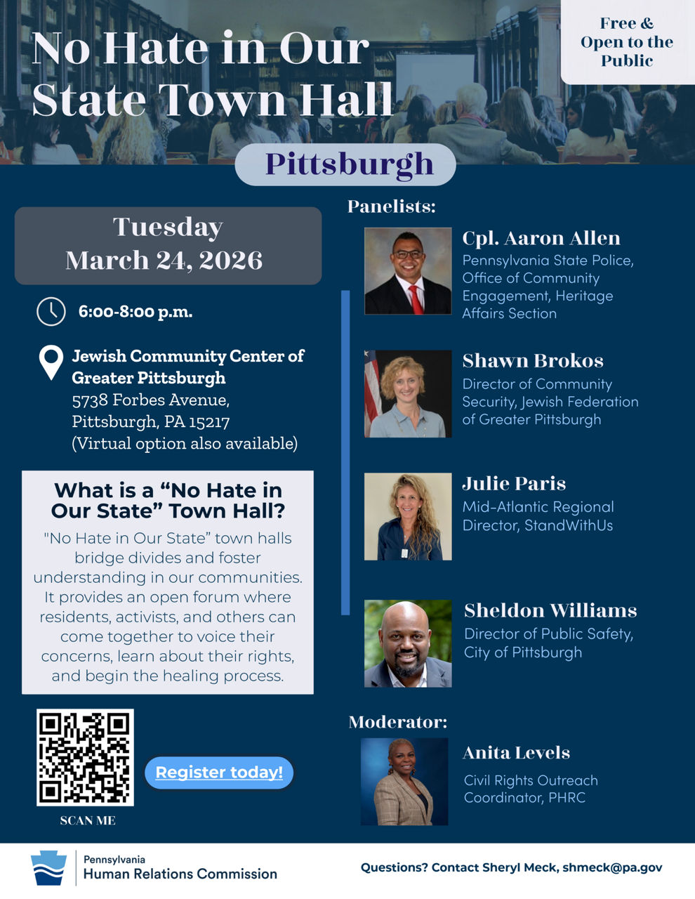 PHRC will host a No Hate in Our State Town Hall in response to the to the antisemitic and racist messages sent out over the Allegheny County Public Safety radio. The event will take place from 6-8 pm at the Jewish Community Center of Greater Pittsburgh, 5738 Forbes Avenue, Pittsburgh, PA.