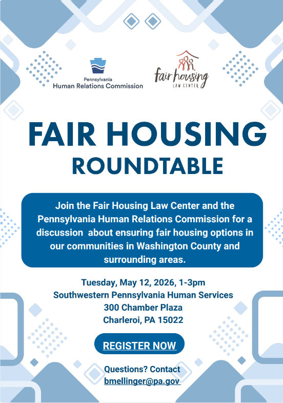 Register today for our upcoming Fair Housing Roundtable! Join the Fair Housing Law Center and the Pennsylvania Human Relations Commission for a discussion about ensuring fair housing options in our communities in Washington County and surrounding areas.